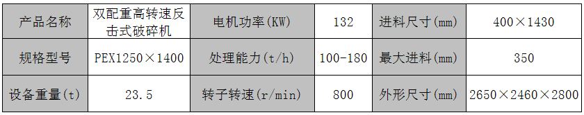 PFX1250×1400雙配重輪高轉(zhuǎn)速升級(jí)型反擊式破碎機(jī)術(shù)參數(shù):