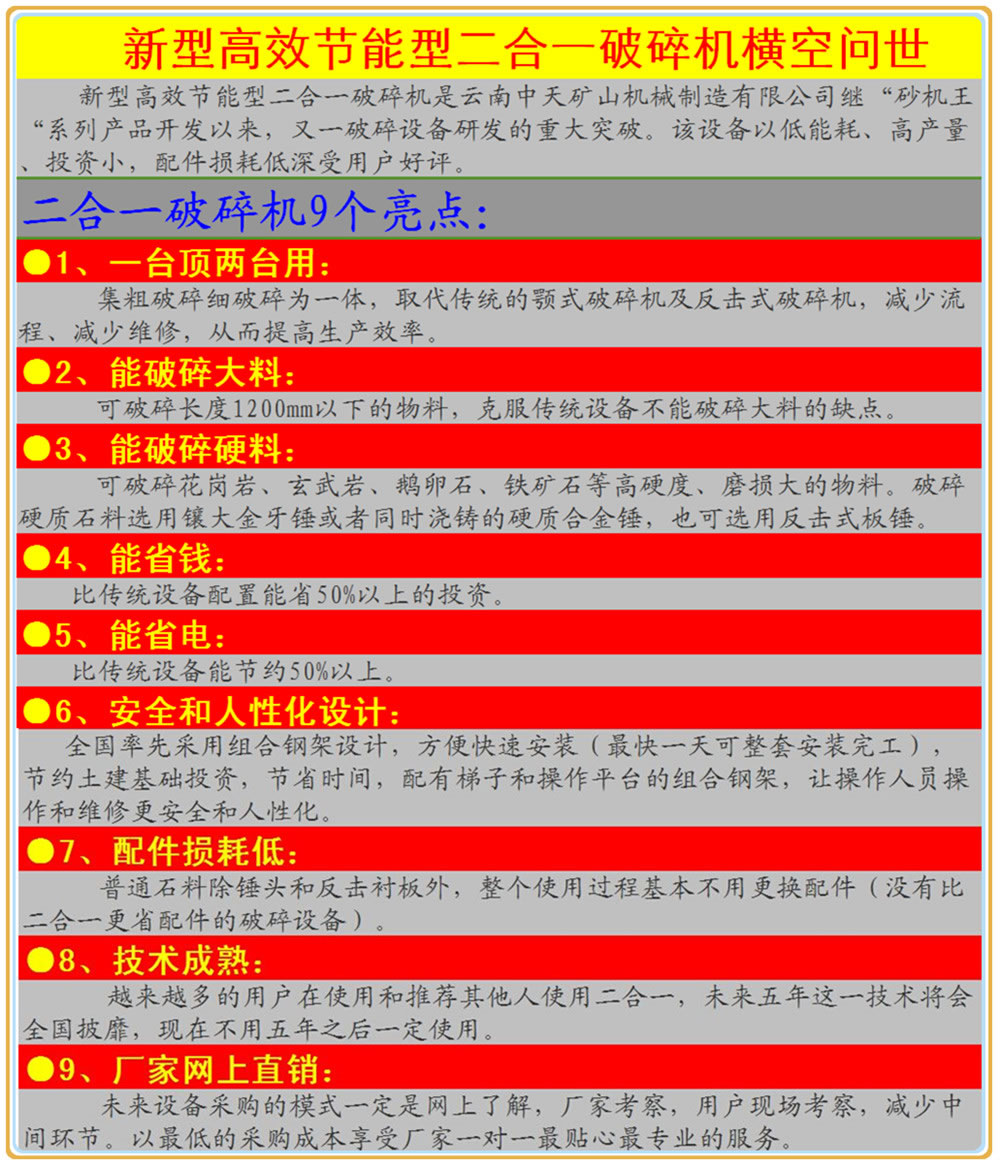 新型高效節(jié)能型二合一破碎機(jī)是云南中天礦山機(jī)械制造有限公司繼“砂機(jī)王“系列產(chǎn)品開發(fā)以來(lái),又一破碎設(shè)備研發(fā)的重大突破。該設(shè)備以低能耗、高產(chǎn)量、投資小,配件損耗低等深受用戶好評(píng)。