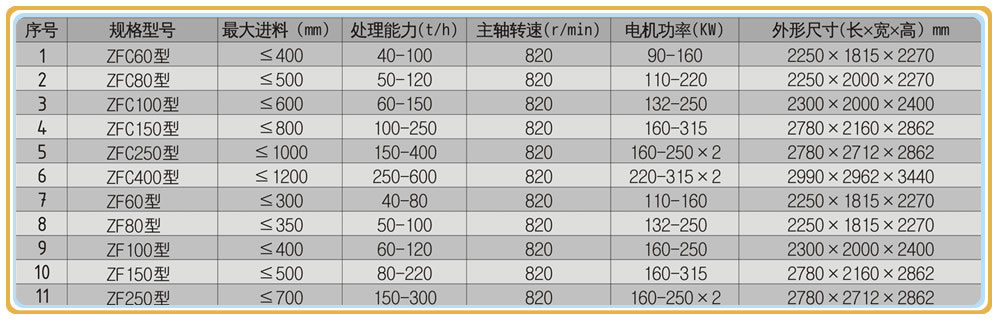 ZFC250型新型高效節(jié)能型二合一破碎機(jī)術(shù)參數(shù):